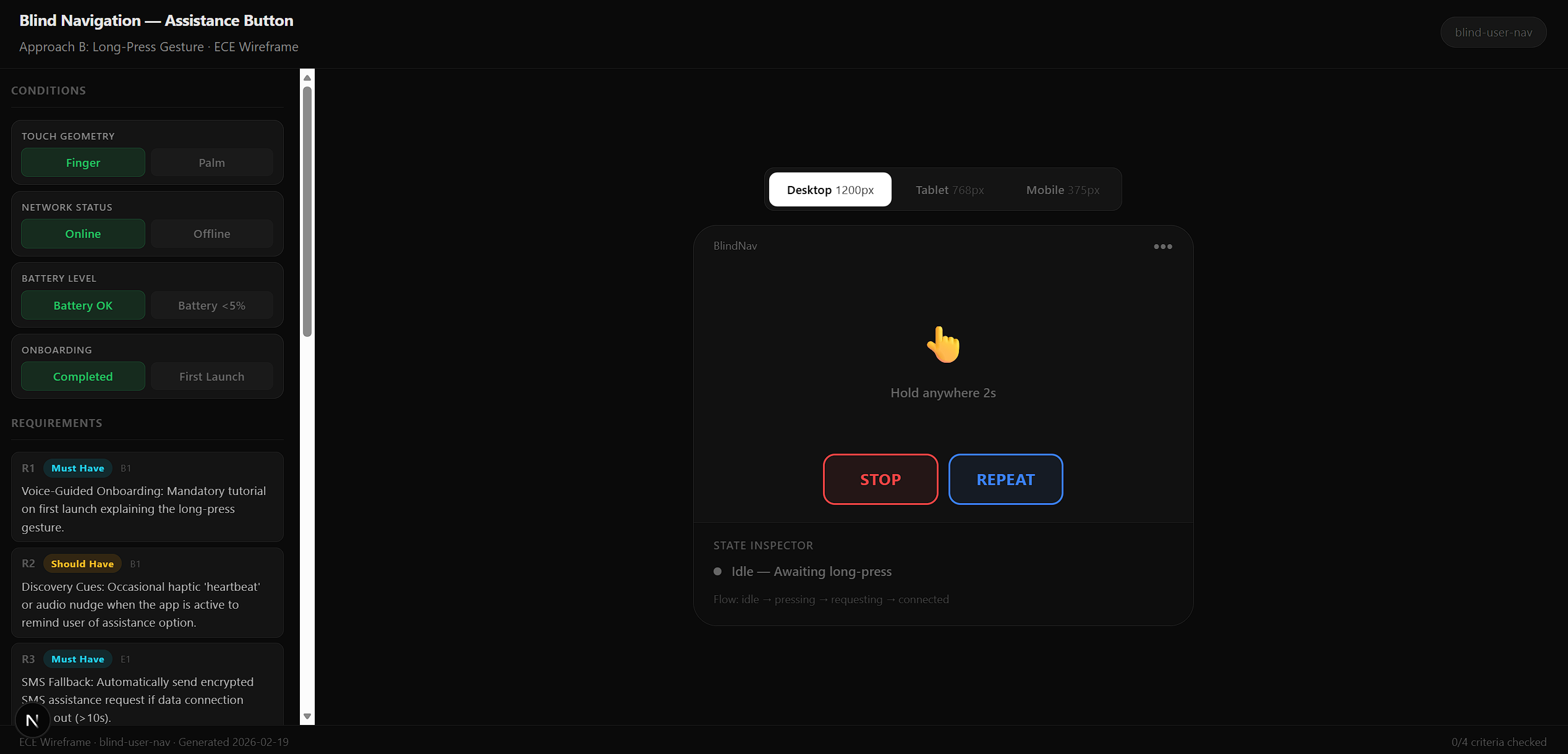 The wireframe below was generated from a real ECE evaluation on the Indoor Navigator project — specifically the Blind Navigation Assistance Button problem. No states were invented. Every toggle condition, acceptance criterion, and edge state derives directly from the solution.md produced by /ece synthesize.
